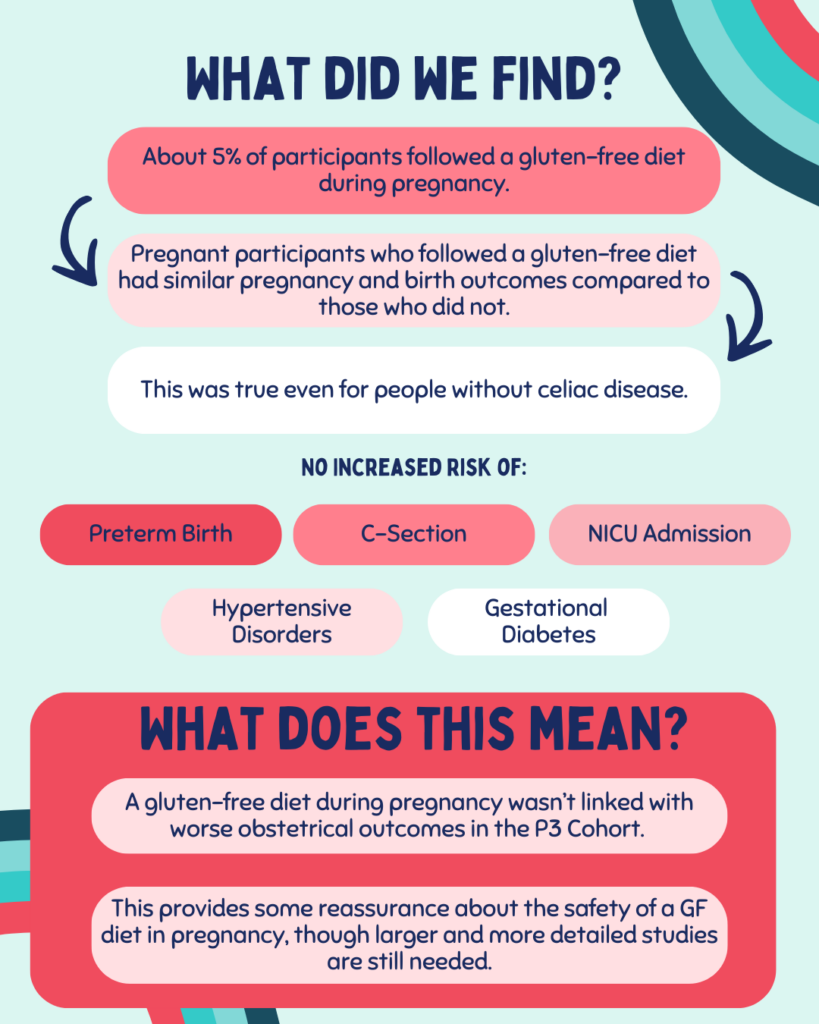 Using data from over 2,300 participants in the P3 Cohort, the study found that about 5% followed a gluten-free diet during pregnancy. Participants who followed a gluten-free diet had similar pregnancy and birth outcomes compared to those who did not. This included outcomes such as preterm birth, gestational diabetes, and cesarean birth—and findings were similar even among participants without celiac disease.